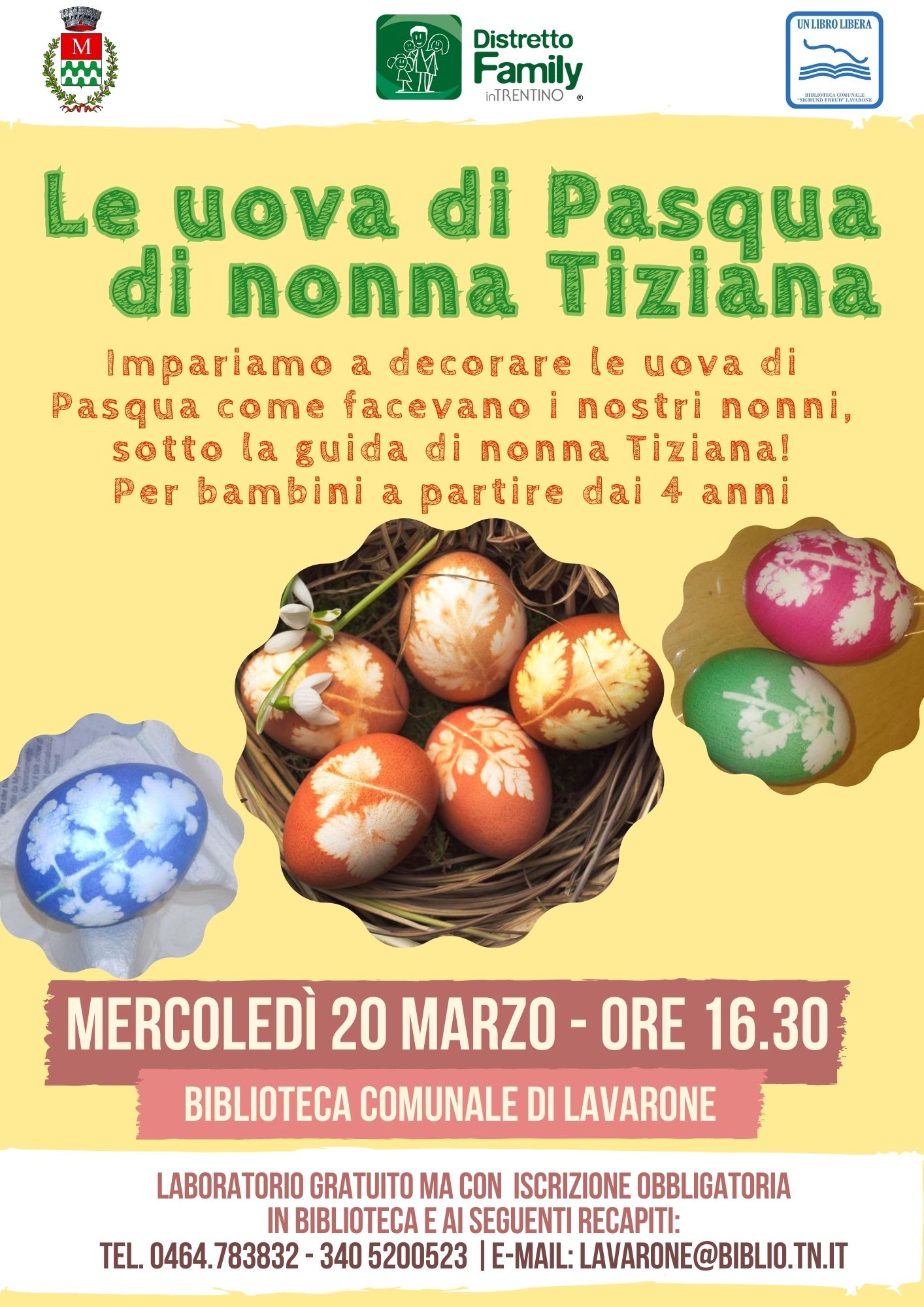 Visto il grande successo dell'anno scorso, anche quest'anno riproponiamo il laboratorio di decorazione delle uova pasquali secondo la tradizione lavaronese di un tempo, sempre sotto la guida di nonna Tiziana e delle sue collaboratrici ovviamente!