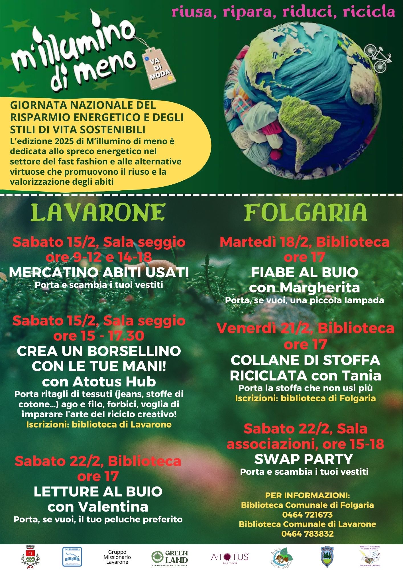 Nella locandina sono riportate le iniziative in programma a Lavarone e a Folgaria e che vedono il coinvolgimento dei Comuni e delle Biblioteche di Lavarone e Folgaria, del Gruppo Missionario di Lavarone, della Cooperativa di comunità Green Land, della Pro Loco Nosellari Oltresommo, di Atotus Hub di Trento.